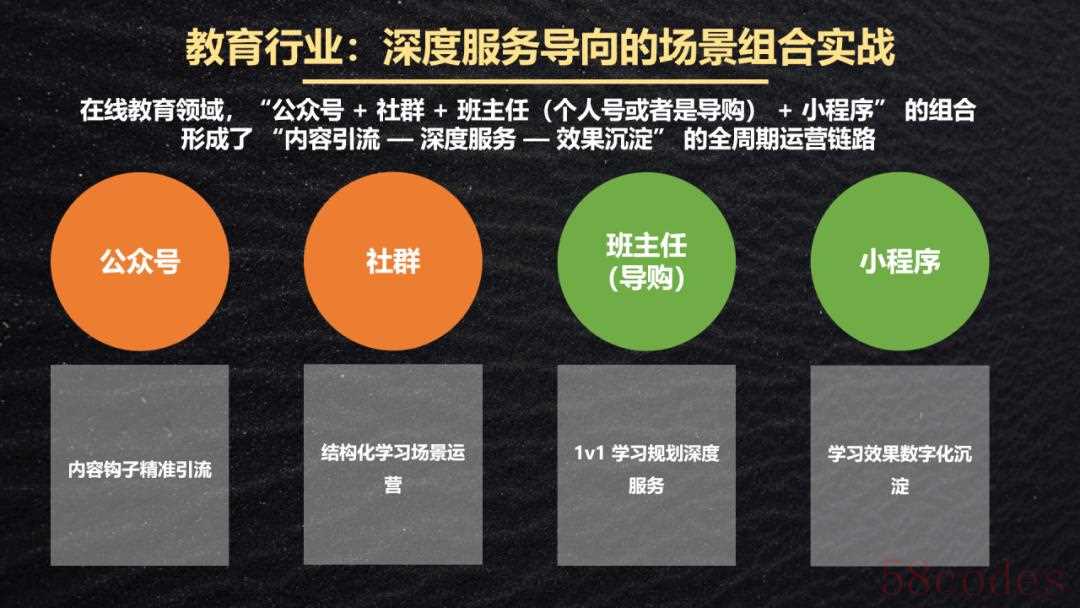 在在线教育领域,“公众号 + 社群 + 班主任(个人号或者是导购) + 小程序” 的组合形成了 “内容引流 — 深度服务 — 效果沉淀” 的全周期运营链路。