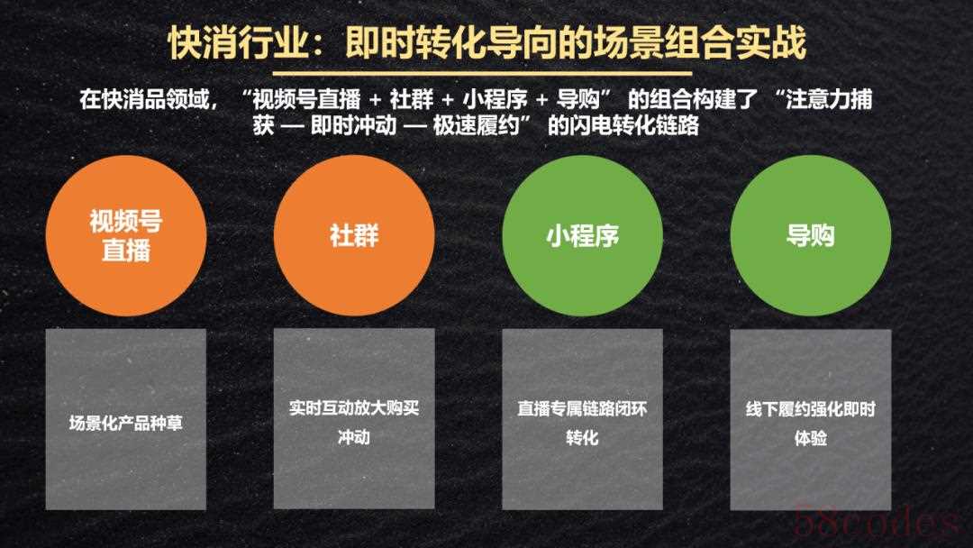 在快消品领域,“视频号直播 + 社群 + 小程序 + 导购” 的组合构建了 “注意力捕获 — 即时冲动 — 极速履约” 的闪电转化链路。