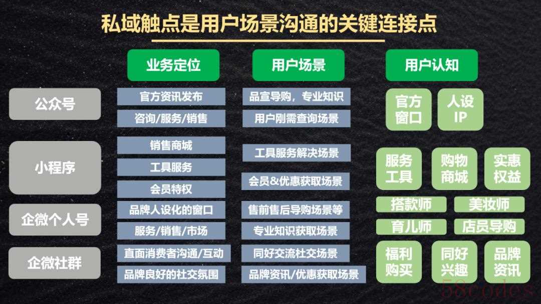 这5大场景是用户在微信生态内与品牌互动的主要触点,建设好这些场景是私域运营成功的关键。每个场景都有其独特的属性和用户心智。