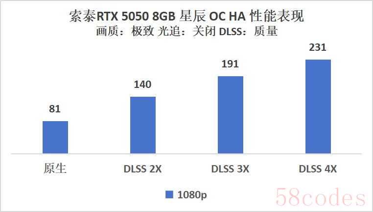 最后是定位在1080P下的RTX5050 8GB星辰OC HA,原生状态下81帧,开启多帧生成后至高提升2.8倍,帧数来到231帧。