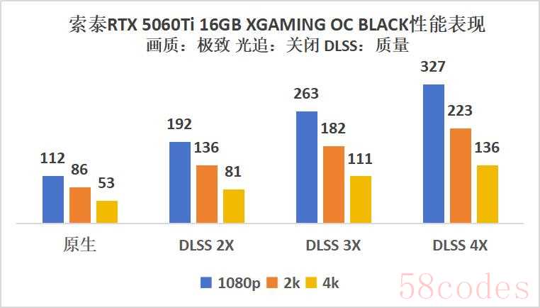 RTX 5060Ti 16GB XGAMING OC BLACK在2K原生状态下86帧,开启DLSS 4X多帧生成后提升2.6倍来到223帧。1080P下更是轻松应对,原生过百112帧,DLSS 4X下超300帧。