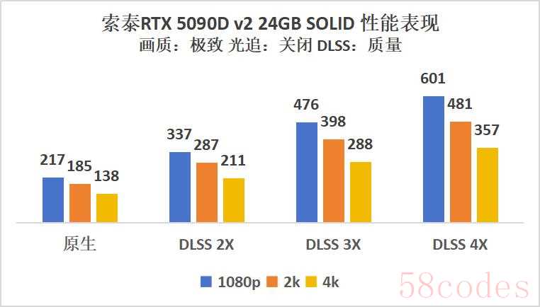 首先是RTX 5090D v2 24GB SOLID显卡,在4K原生状态下大约138帧,开启DLSS 4X后帧数提升2.8倍来多357帧,同样在2K也有类似涨幅,帧数481帧,1080P下更是突破了600帧。