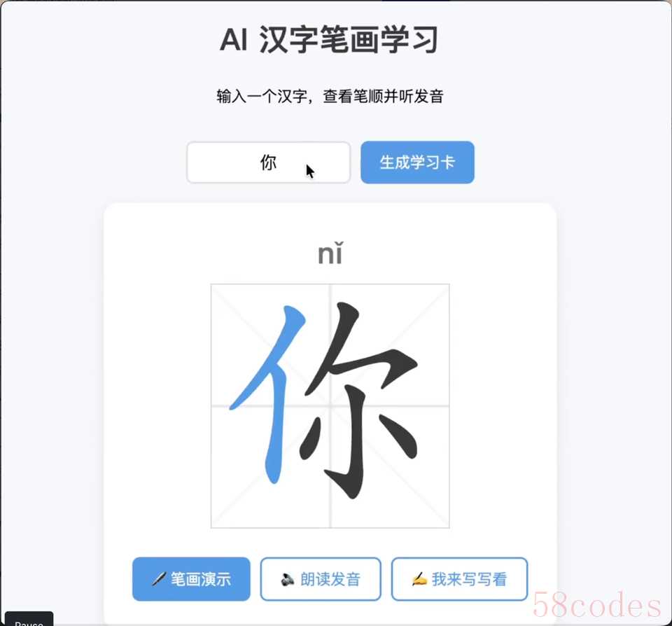 制作一个学习写字笔划的 AI 学习工具网站;当用户输入一个字时,你就在田字格上模拟手写字,一笔一划写出来,同时搭配读音拼音。