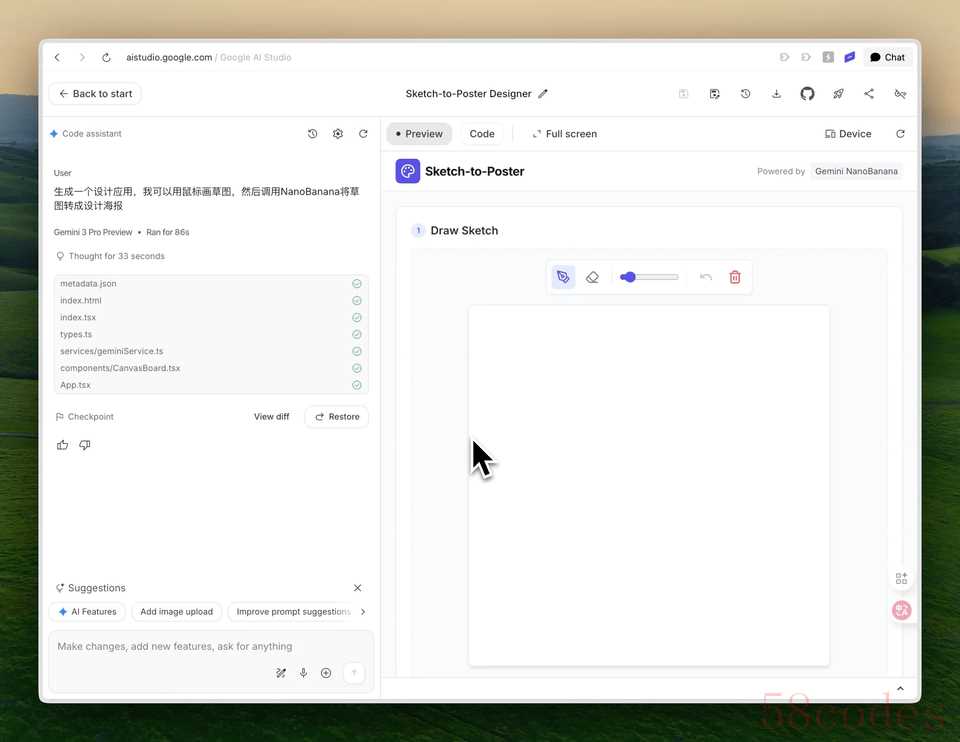 生成一个设计应用,我可以用鼠标画草图,然后调用NanoBanana将草图转成设计海报