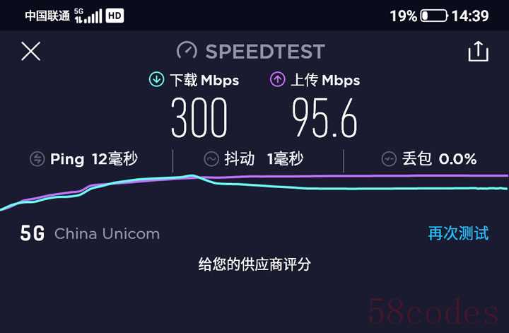 我们选用专业网速测试软件,选用默认连接节点,测试5G网络条件下海信5G阅读手机A7的传输速度。实测其在5G网络下可以达到下行300Mbps,上行95.6Mbps,抖动1ms的水准。