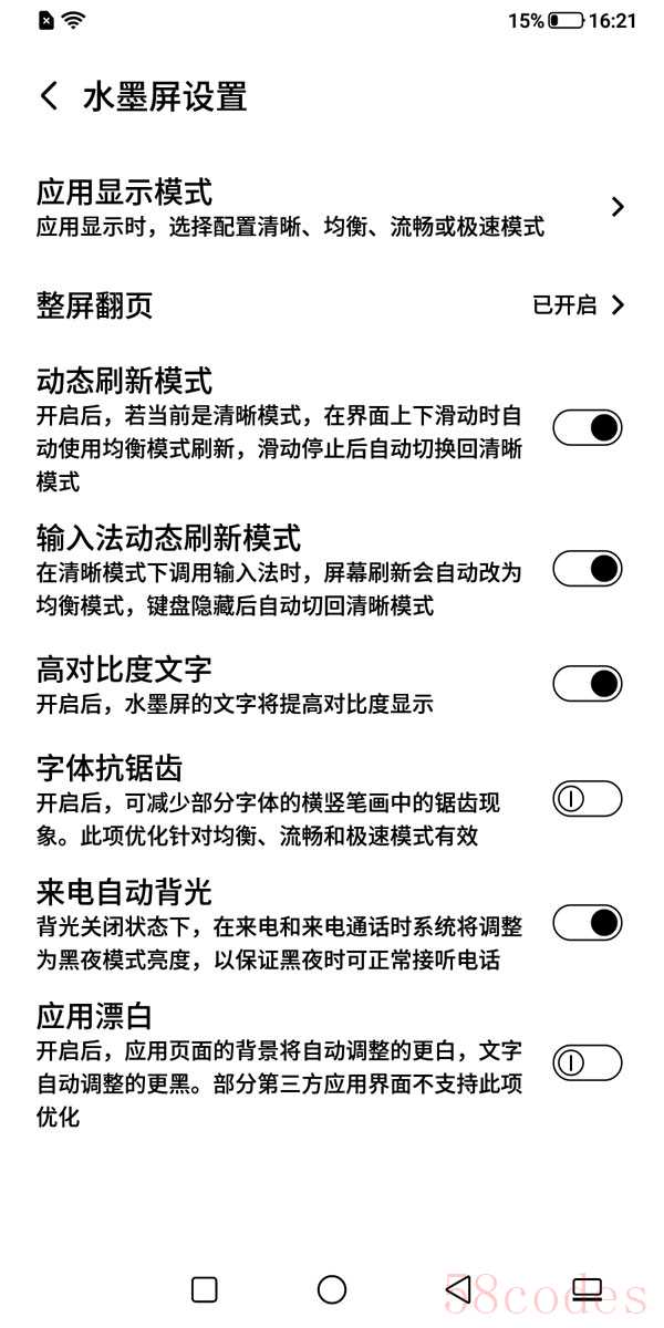 为了保证用户阅读文字的显示效果,海信5G阅读手机A7还可在水墨屏设置选项中开启高对比度文字、字体抗锯齿、来电自动背光以及应用漂白选项。其中,高对比度文字与应用漂白均可提升画面对比度,前者增加文字对比度,后者可漂白背景,加黑文字,但可能不兼容第三方APP。字体抗锯齿功能可使得文字显示更加锐利,主要针对“均衡”“流畅”“极速”三种应用显示模式。