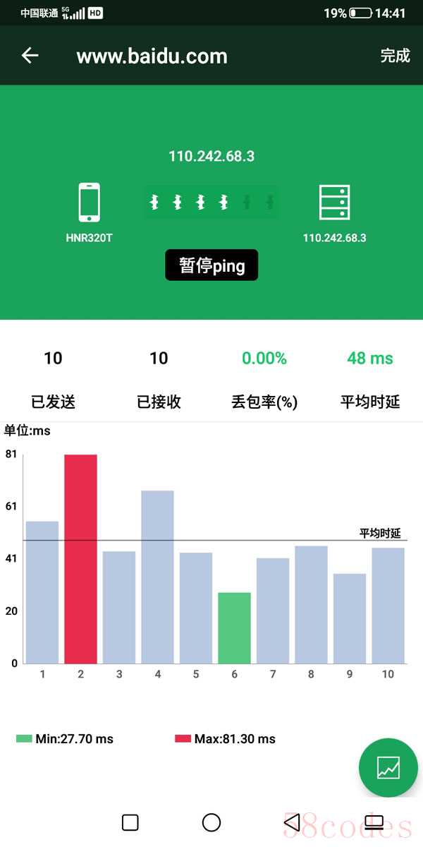 随后,我们打开专业网络测试工具,测试在5G网络下访问百度时的延迟。5G网络下,海信5G阅读手机A7最高延迟81.3ms,最低延迟27.70ms,平均延迟48ms,延迟比一般的5G机型要低许多,具有显著的低延迟优势。这样看来,海信5G阅读手机A7的5G网络实测表现还是相当出色的,但在以听书阅读为主的使用场景下应用并不多,其最大的优势实际上体现在信号稳定性方面。值得一提的是,海信5G阅读手机A7拥有4770mAh大容量电池,并配备有18W快充。这样的续航充电配置对于一款使用水墨屏的机型来讲,算得上豪华配置了,手机本身不仅能够持久供电,满足长时间阅读的使用需求,也能够轻松支撑起5G元器件的功耗需求。用户还可利用碎片时间进行快速补电,从此告别电量焦虑。