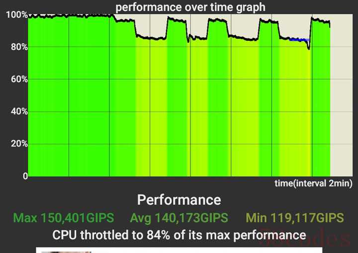 为了测试海信5G阅读手机A7的性能稳定性表现,我们使用CPU Throttling Test进行了CPU拷机,看一看海信5G阅读手机A7的极限算力表现。在15分钟的测试过程中,虎贲T7510 5G芯片的CPU发挥出84%的极限算力,强势保持最高主频。