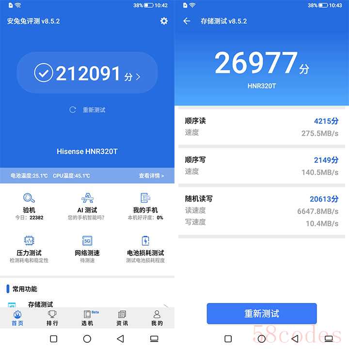 我们使用安兔兔进行综合跑分和存储测试。综合跑分方面,海信5G阅读手机A7得分212091分。存储测试方面,海信5G阅读手机A7测出的顺序读写速度分别为270.5MB/s和140.5MB/s,随机读写速度分别为6647.8MB/s和10.4MB/s。