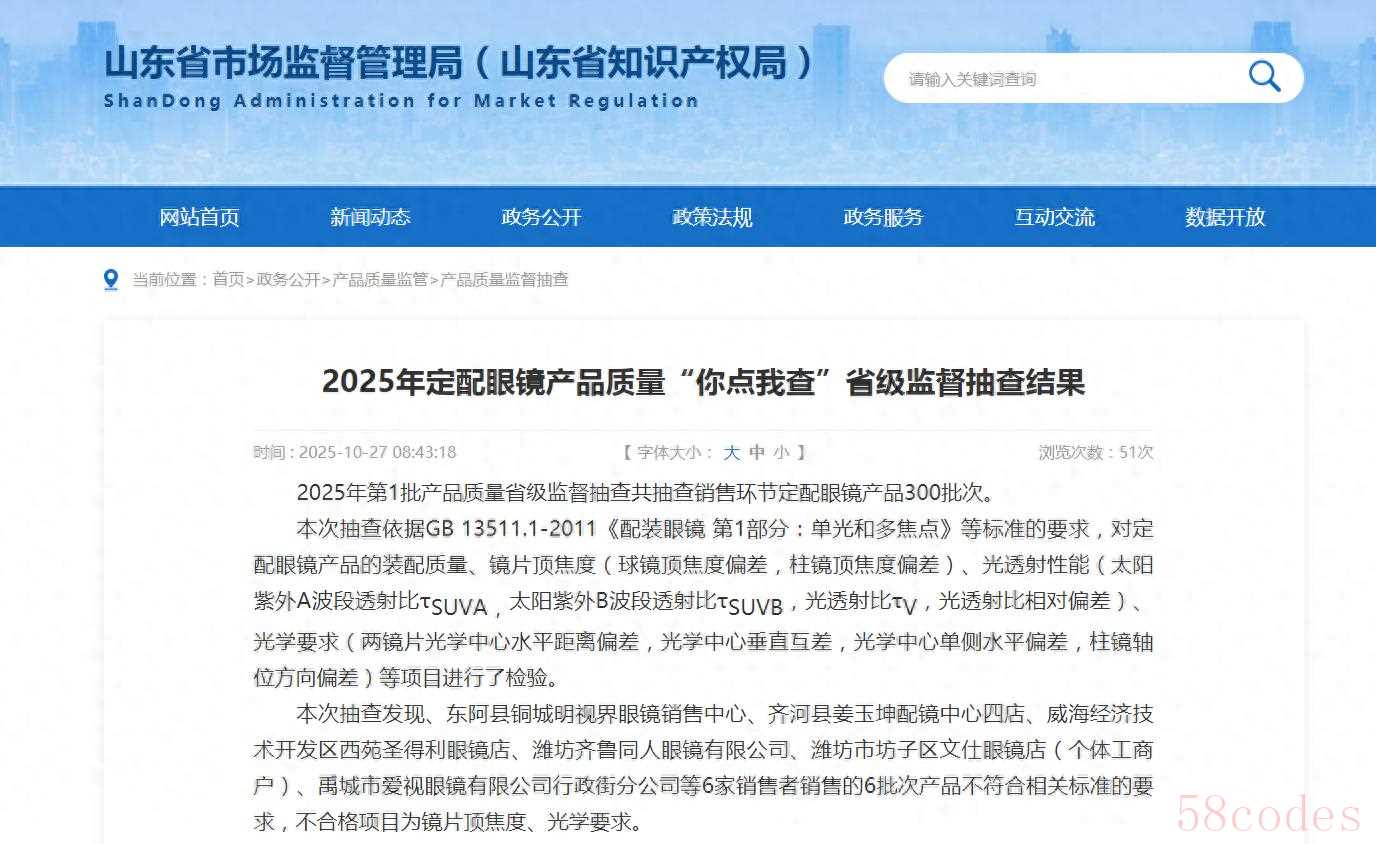 中国质量新闻网讯 近日,山东省市场监管局网站发布2025年定配眼镜产品质量“你点我查”省级监督抽查结果。