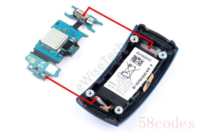 2. "电池:" 电池是拆卸时最明显的部件之一。Gear Fit 2配备了比Gear Fit更大的电池(通常约为 80mAh,而Gear Fit约为 61mAh),这直接支持了其更长的续航时间和更大的存储容量。