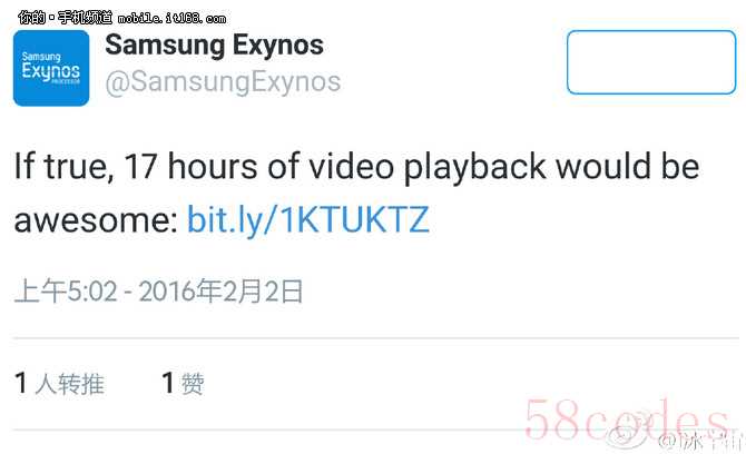 值得一提的是,针对此前传出三星GALAXY S7在屏幕最高亮度的情况下,能够支持长达17小时的视频播放时间的说法,三星官方也在推特上进行了转发,所以在外界看来似乎意味着官方默认了三星GALAXY S7确实在续航表现上有惊人之处。而在此前,俄罗斯网站知名主编Eldar Murtazin的团队曾经声称,三星GALAXY S7在最高屏幕亮度下,能够获得17小时视频回放时间。