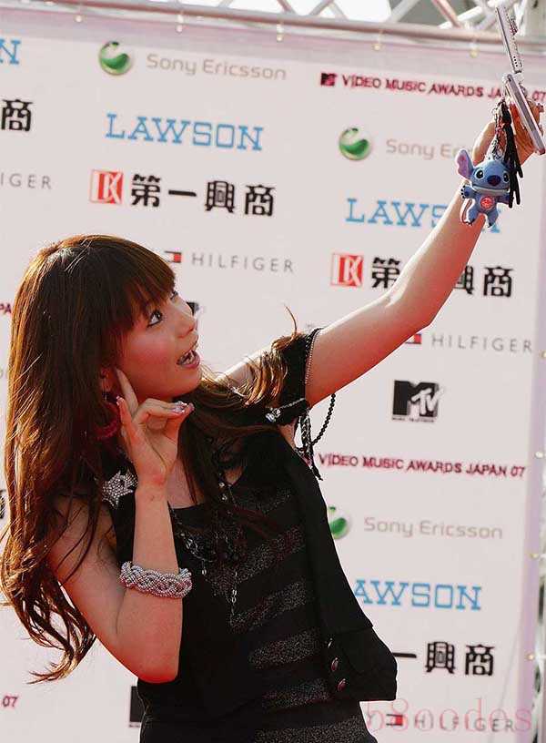 2007年5月26日,东京,日本女歌手中川翔子(Shoko Nakagawa)用翻盖手机自拍。因为当时没有前置摄像头,自拍往往需要翻转手机。 视觉中国 资料图