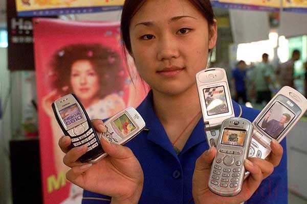 2003年8月23日,店员手中拿着都是当时热销的手机。 视觉中国 资料图
