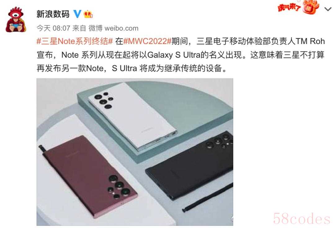 今天,新浪数码在最新的报道中提到,“在MWC2022期间,三星电子移动体验部负责人TM Roh宣布,Note 系列从现在起将以Galaxy S Ultra的名义出现。这意味着三星不打算再发布另一款Note,S Ultra 将成为继承传统的设备。”