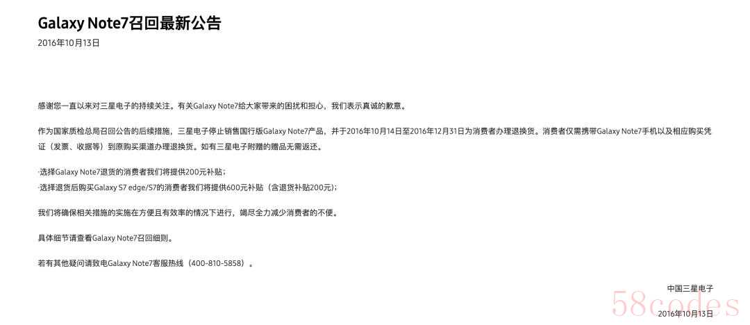 随后的2016年10月13日,三星官方发布了《Galaxy Note7召回最新公告》。