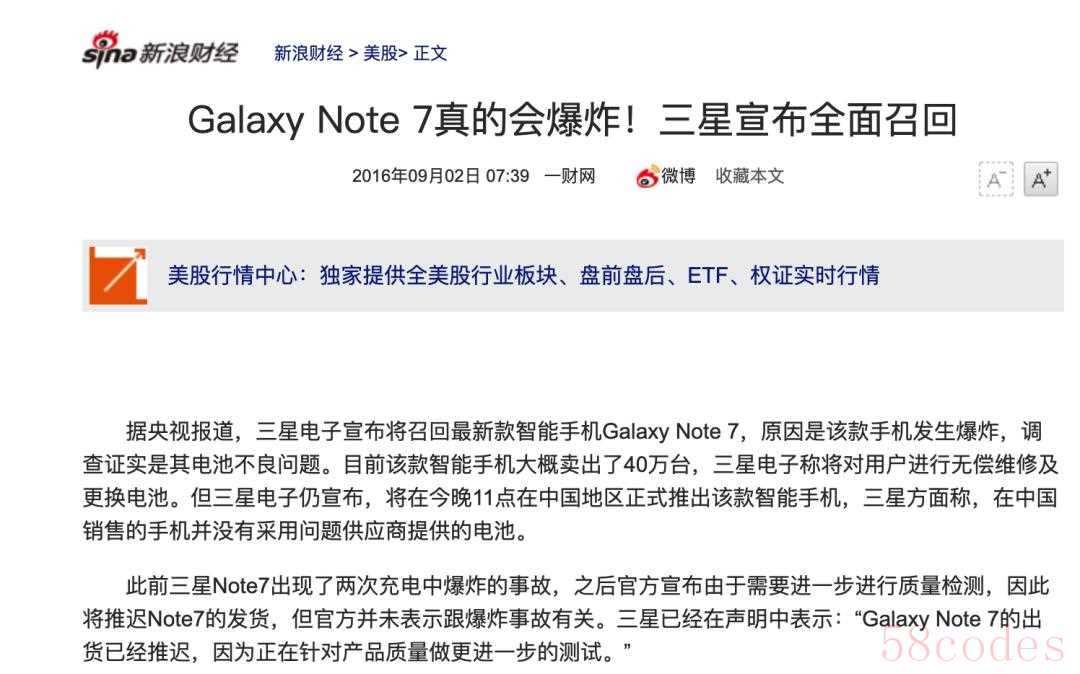 新浪财经在2016年9月2日的一篇报道中提到,“三星电子宣布将召回最新款智能手机Galaxy Note 7,原因是该款手机发生爆炸,调查证实是其电池不良问题。目前该款智能手机大概卖出了40万台,三星电子称将对用户进行无偿维修及更换电池。”