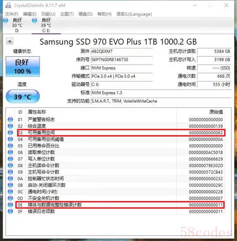 其中判断三星固态硬盘是否出问题的重要信息,就是查看 0E 这一行。