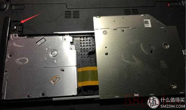 接下来就是装固态硬盘的时候了,我在这还是学习到了,有先将光驱弹出。(此时我已经默默的将底板上回去了)将红箭头处的挡板搬下来,还是很好搬下来的。