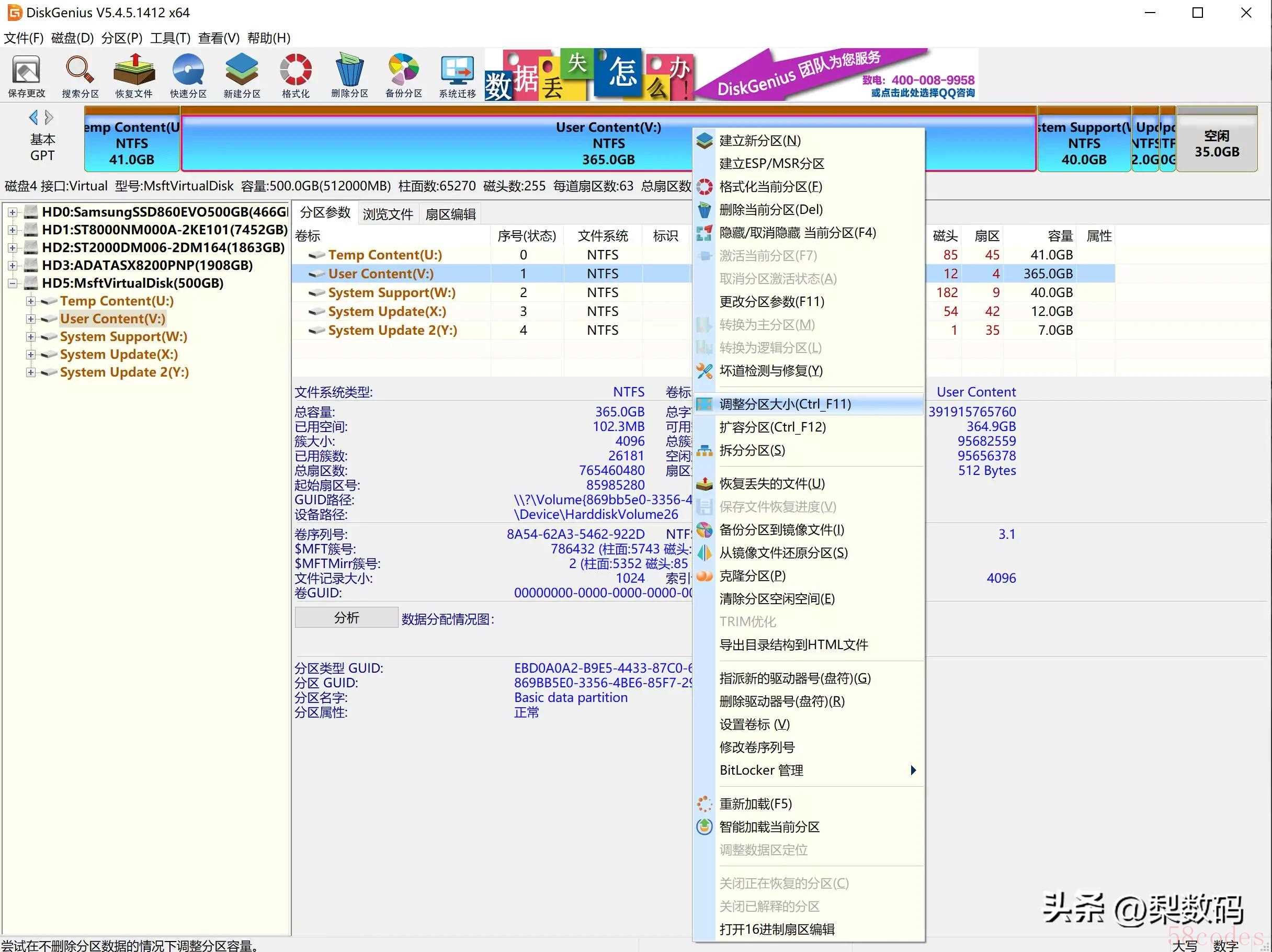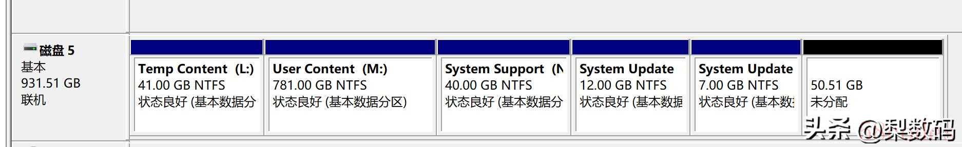 打开 DiskGenius 可以看到分好区的磁盘,剩下的就简单的,就是根据实际要换的新盘容量来调整 User Content 分区的大小,User Content 就是实际的装游戏可用空间,其他几个系统分区千万不要动。