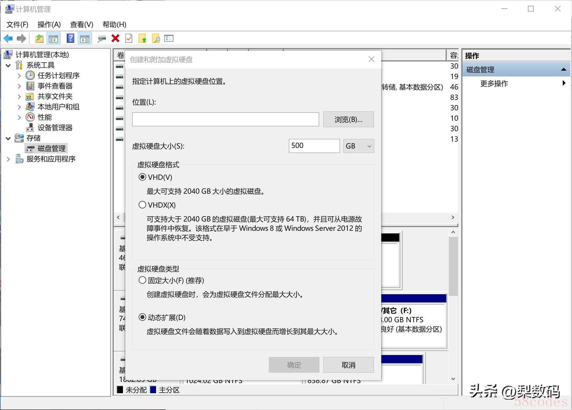 容量最少得 500G,类型动态扩展,选个位置保存就行: