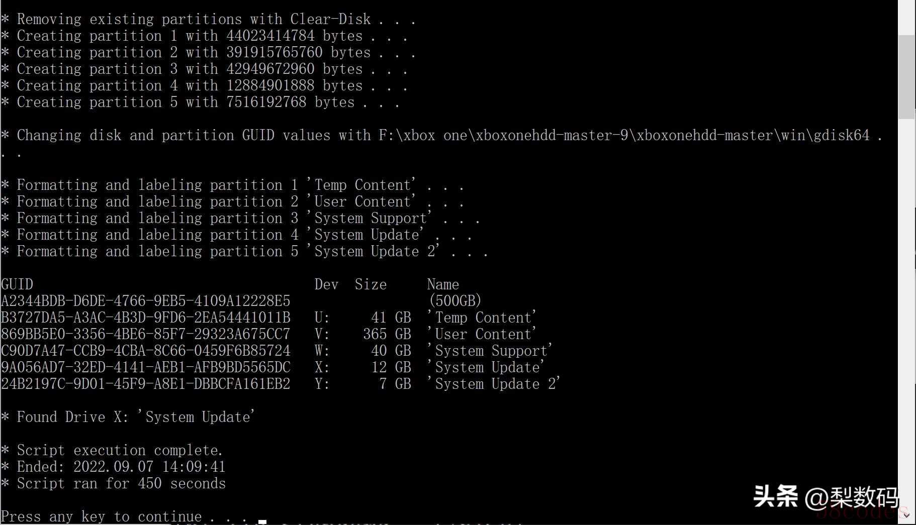 然后会全自动进行分区过程,最后任意键退出即可: