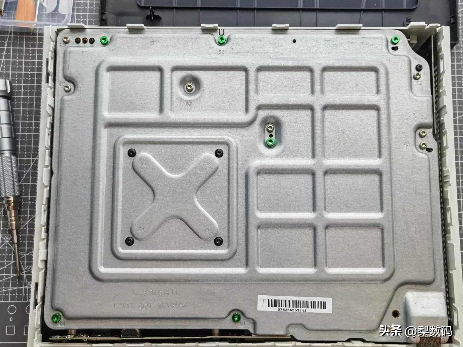 去掉底壳后就能看到固定主板的内部金属壳了,微软的内部设计还是很不错的,每个螺丝孔都有特定编号,每个编号大类的螺丝规格都一样,很容易区分。首先把绿色的 F1-F6 螺丝拧掉,然后把接口那一面朝向自己,两端上盖向外掰一点,往上一抬就能拿出整体主板外壳了: