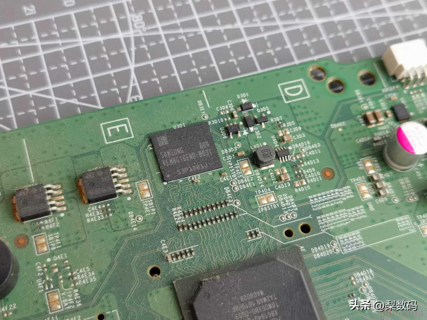 把所有大件拆掉后,在主板上边缘处可以看到个板载的 eMMC 颗粒,型号为 KLM8G1GEEND-B031,来自三星。
