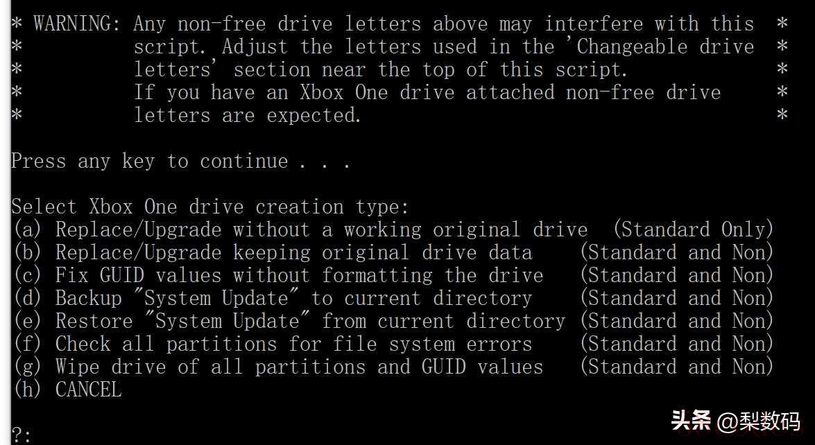硬盘挂上后把脚本下载解压,管理员身份运行 win 目录下的 create_xbox_drive.bat,因为是空盘,所以选 A: