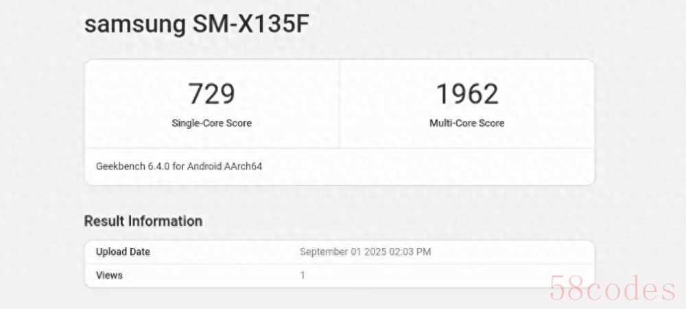 最新消息显示,三星新款平板 Galaxy Tab A11平板现已现身 GeekBench 跑分库,4G 版本(型号 SM-X135F)在 6.4.0 版本单核成绩为729分,多核成绩为 1962分。