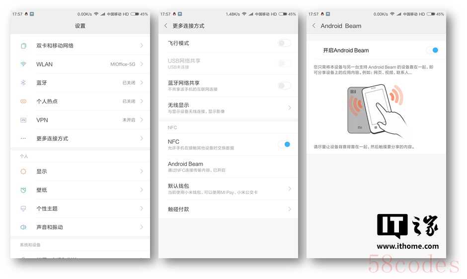 IT之家注:Android Beam 功能首次出现于 Android 4.0 系统,可让两台拥有 NFC 功能的手机互相触碰,启动蓝牙传输图片、联系人资料、网址、导航等数据,但这项功能最终在 Android 10 停止开发,转而由“快速分享”功能替代。