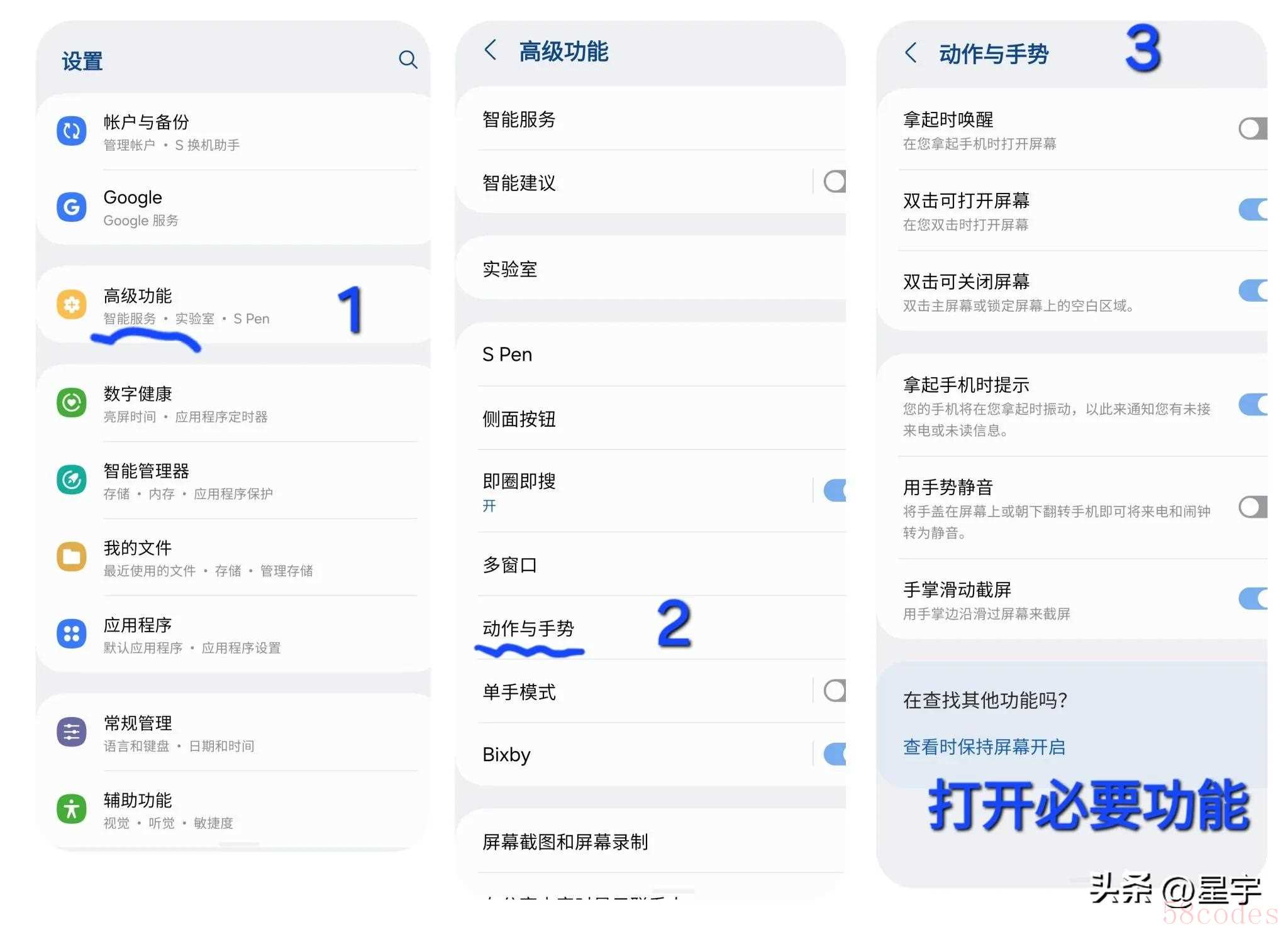 基本动作与手势设置:双击打开和关闭屏幕等。设置方法:设置>高级功能>动作与手势,可以选择打开或者关闭以下功能。