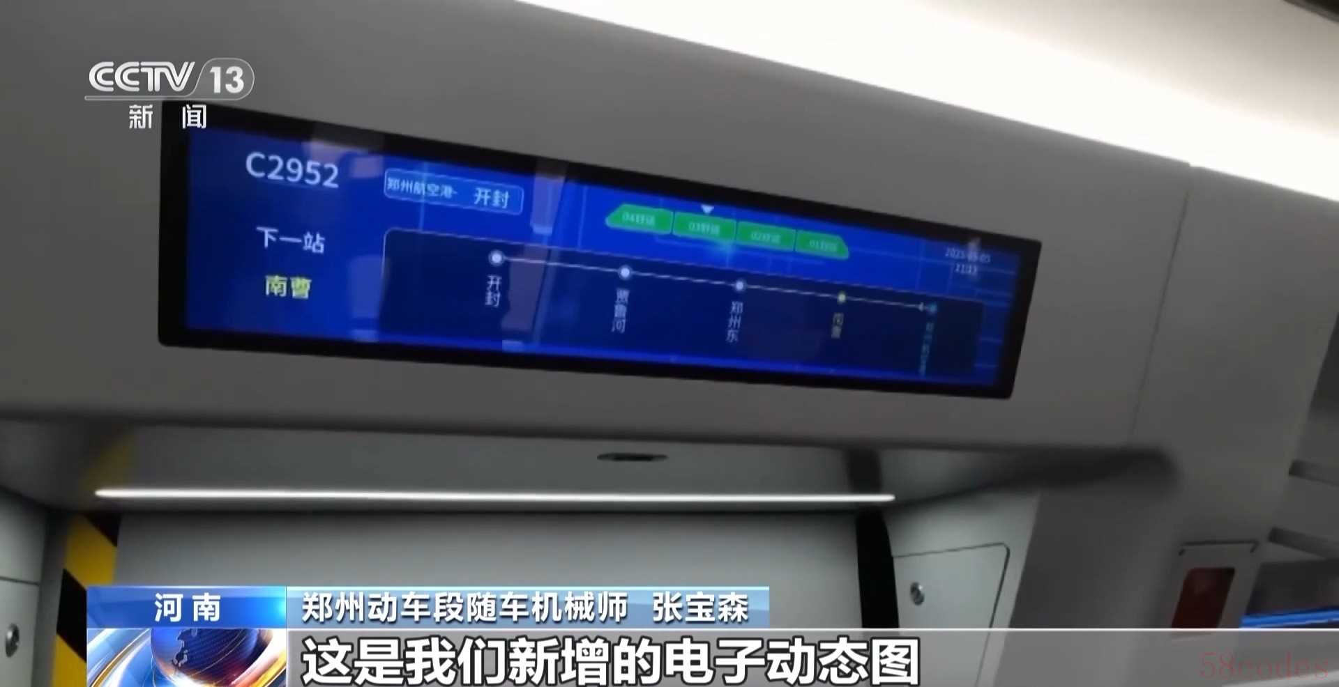 郑州动车段随车机械师 张宝森:这是我们新增的电子动态图,里面涵盖了时间、日期、车次以及各个停靠站,上面显示的01到04车舒适,是我们车厢温度以及客流量的综合情况。有了它以后,方便旅客随时掌握列车的运行信息。