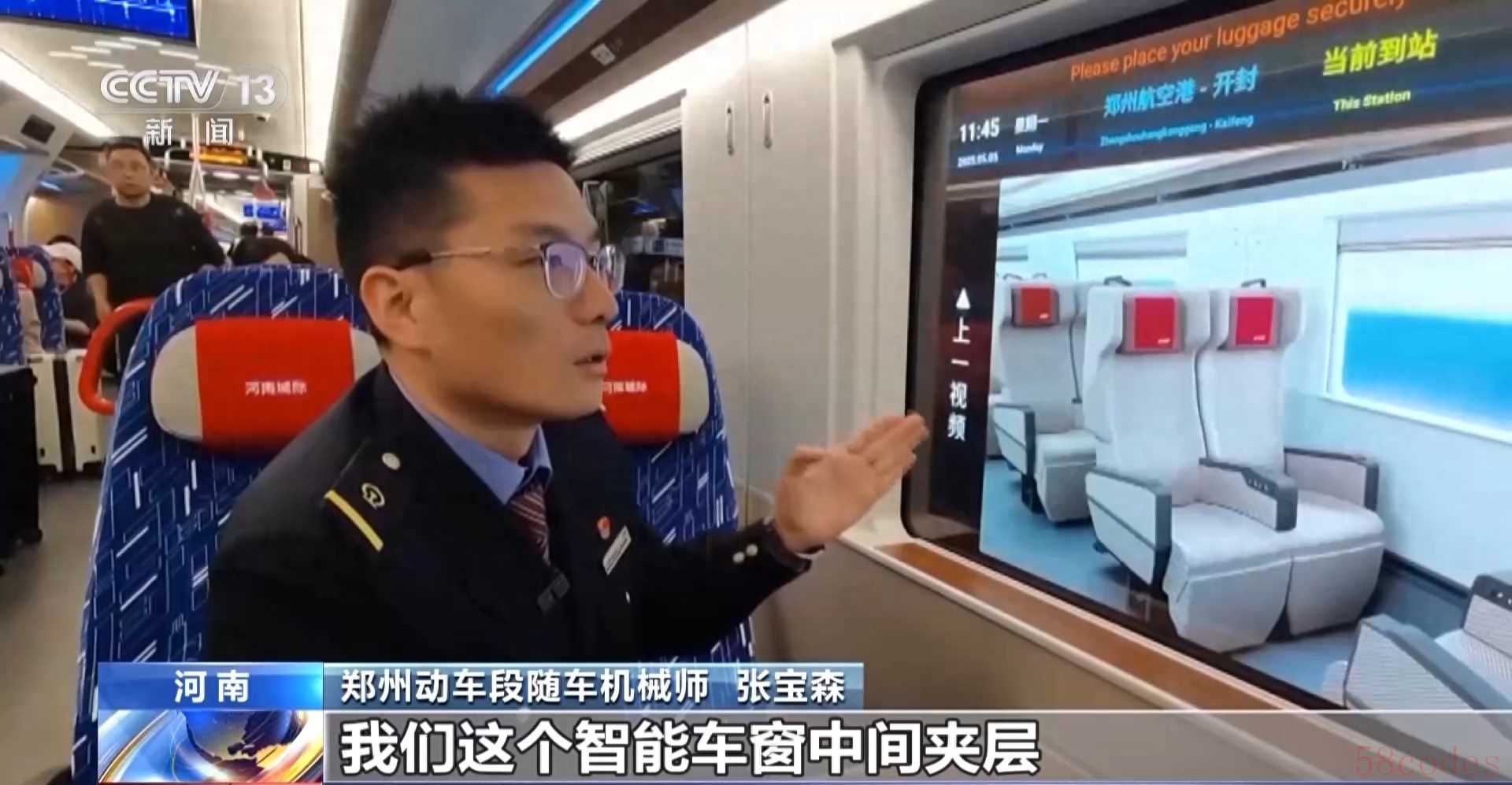 郑州动车段随车机械师 张宝森:我们这个智能车窗中间夹层融入了OLED(有机发光二极管)自发光透明显示层,同时和电容触摸层结合,这样的话车窗上高清通透显示了车辆信息的同时,赋予了车窗智能化交互属性,旅客既可以欣赏风景,又能够查看车辆信息。