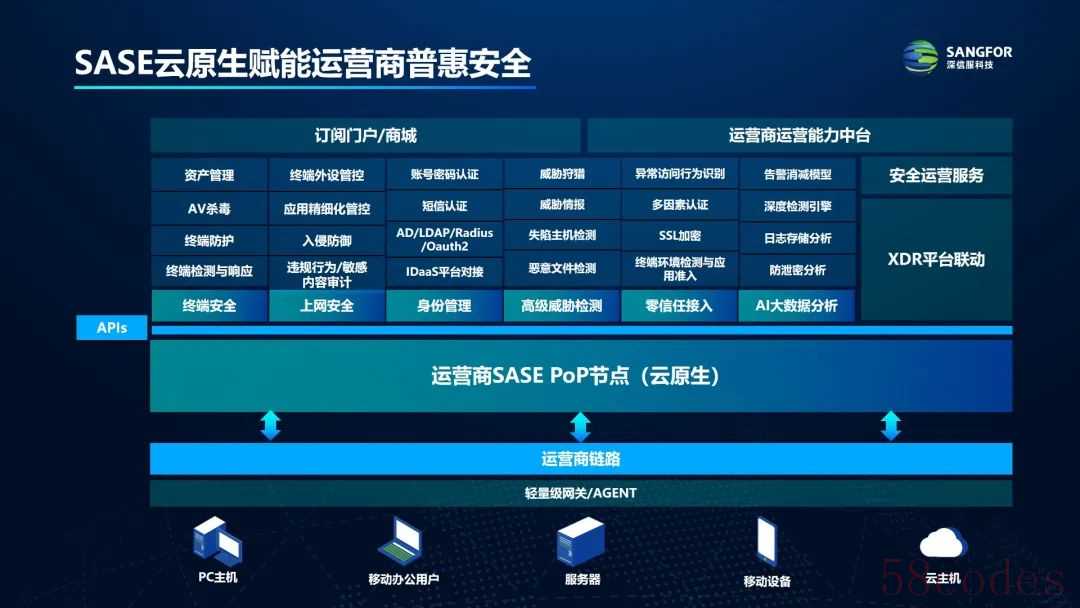 SASE 3.0通过平台方式把安全工具化、服务化,从而能够让运营商为广大用户提供初步的安全服务能力,同时我们将开放SASE 3.0能力对接深信服MSS、XDR平台以及广大安全生态伙伴、以便用户给提供更高阶的和一站式安全服务。