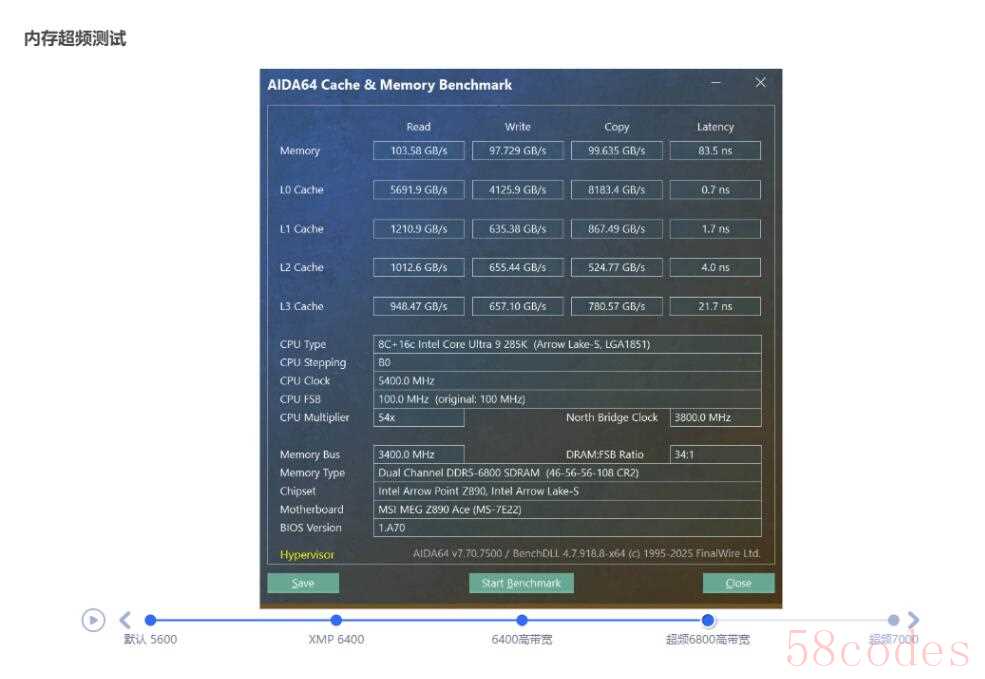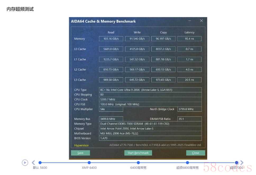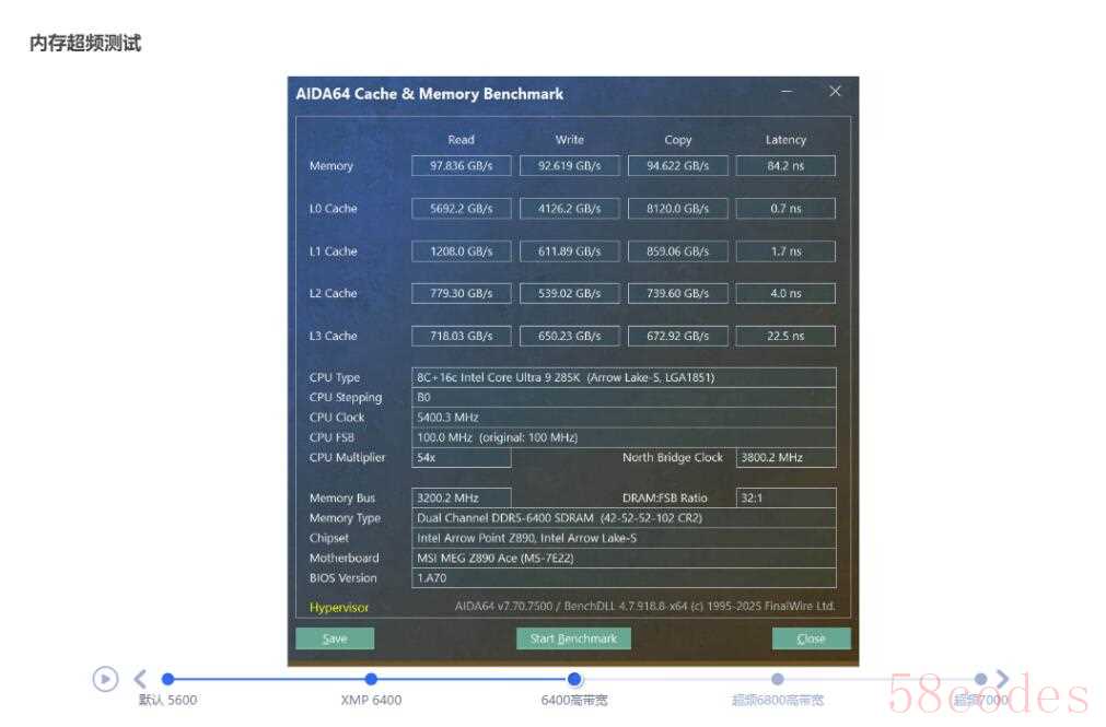 超频测试用的是酷睿Ultra 9 285K处理器,配的是微星 MPG Z890 ACE战神主板,从内存默认的5600MT/s频率开始测试,然后慢慢把频率提上去,并且超频至极限为止,测试内存的带宽与延迟。