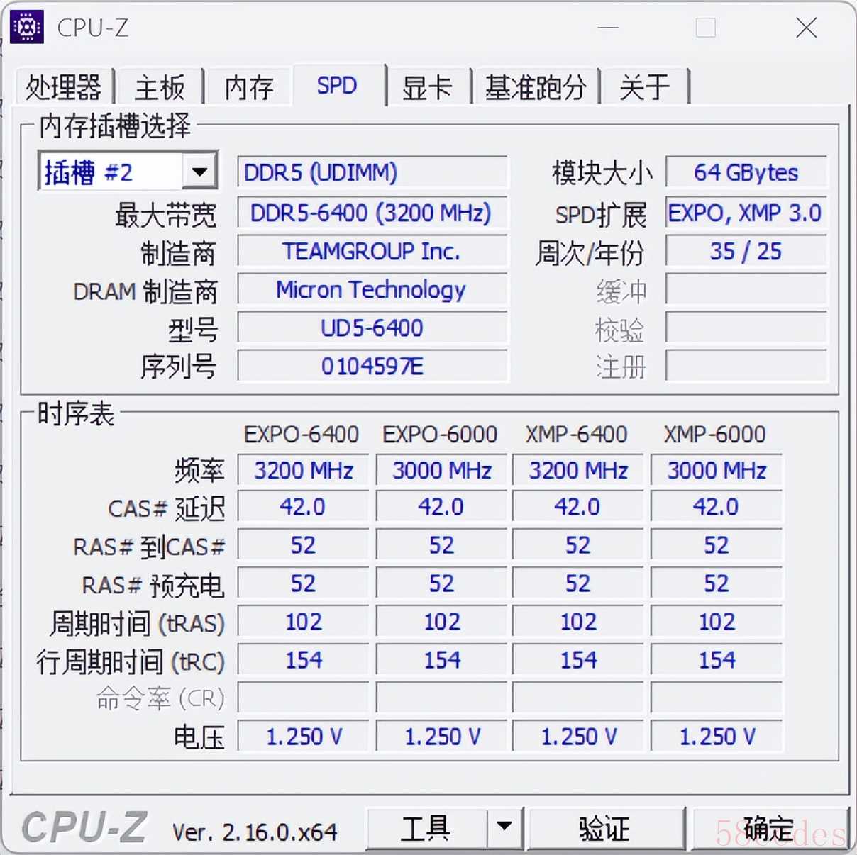 这套T-CREATE EXPERT引领者DDR5 128GB内存不光支持Intel XMP 3.0和AMD EXPO,而且每个都有两套频率和时序,一套是6400MT/s,另一套则是6000MT/s,两者的时序都是42-52-52-102,工作电压1.25V。AMD的那边做6400MT/s和6000MT/s两个频率很好理解,因为不是所有CPU能跑6400MT/s 1:1的,而6000MT/s 1:1性能可比6400MT/s 1:2性能强多了,所以做这两个频率,而Intel那个的6000MT/s可能是顺便附带的。