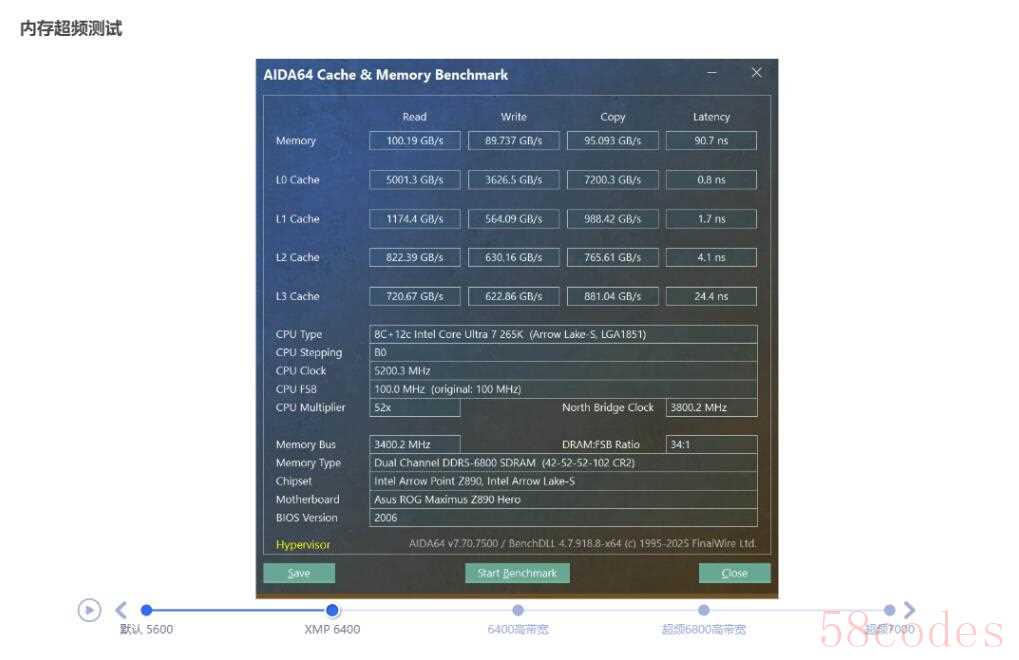 默认状态内存频率是5600MT/s,内存读写速度在79~83 GB/s之间,内存延迟108ns;开启XMP 6400MT/s那档,此时内存带宽在89~100GB/s左右,内存延迟降低至91ns; 在这基础上开启主板自带的内存高带宽模式的话,内存带宽变成了92~98GB/s,内存延迟降低至84ns;内存能稳定超频至6800MT/s,时序和电压都不需要动, 可开启主板的内存高带宽模式,在该频率下内存带宽的97~103GB/s,延迟大概是84ns;这套内存能达到的最高频率是7000MT/s,时序48-61-61-119,这个频率是过不了稳定性测试的,也开不了内存高带宽模式。