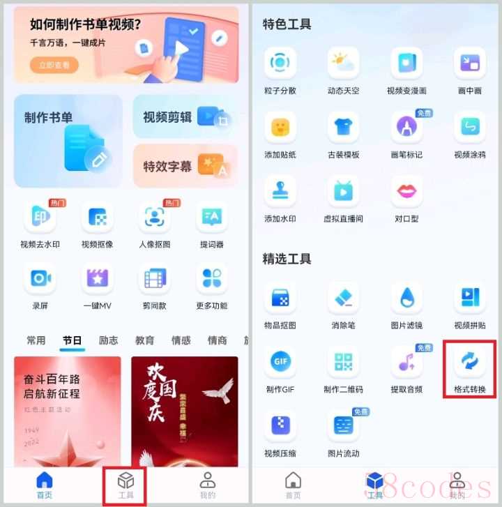 一款简单好用且功能很丰富的手机视频剪辑工具,它支持包括视频剪辑、抠像、变速、变音、压缩以及格式转换等多个功能,打开之后我们可以在【工具】中找到【格式转换】。