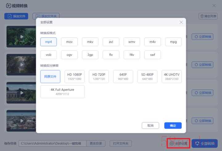可以直接将所有需要转换格式的视频存放于一个文件夹导入,点击【全部设置】设置转换后的视频格式以及分辨率,最后设置好视频的存储位置点击【全部转换】就完成了。