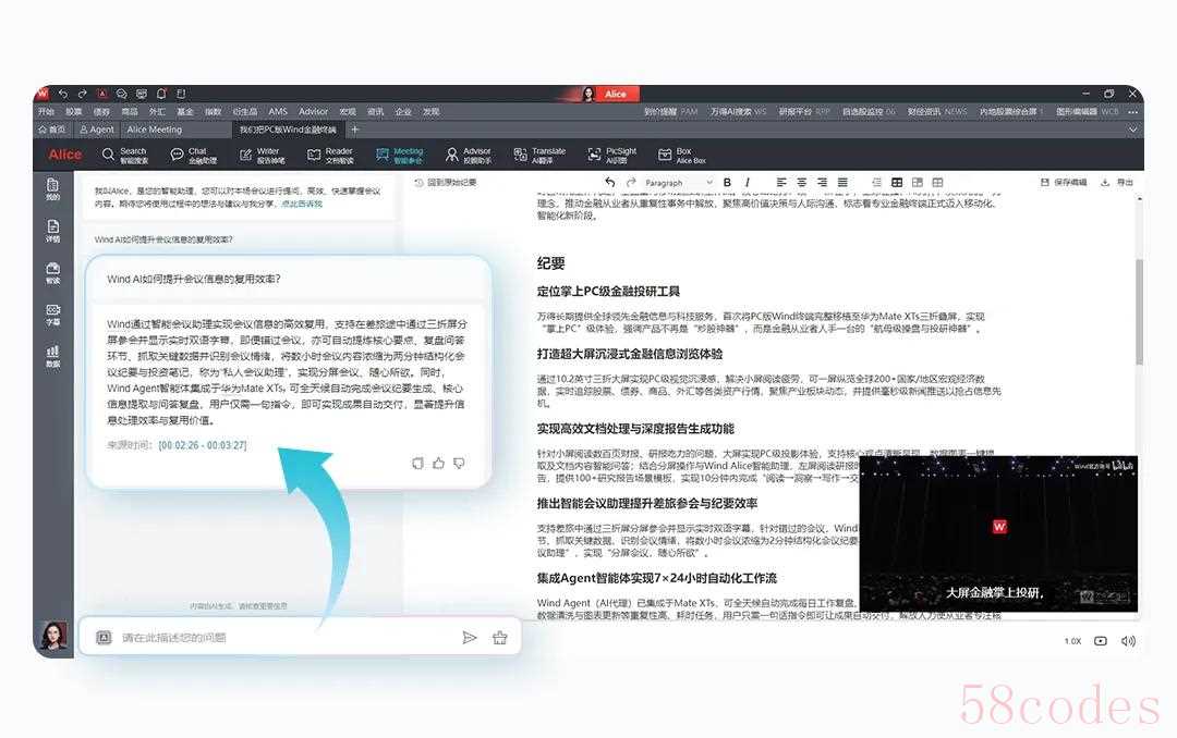 左下角输入框内提问"Wind PC版功能在移动端有何突破?",Alice会立即为您定位相关内容,提供准确的答案