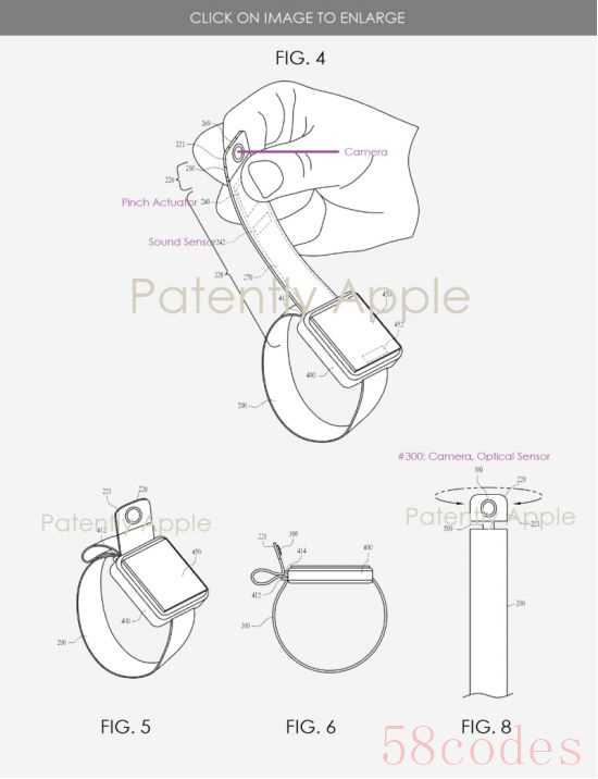 苹果甚至还设想过可以在手表的表带上安装两个镜头,每侧各一个,这样就可以360度拍照或者视频了。