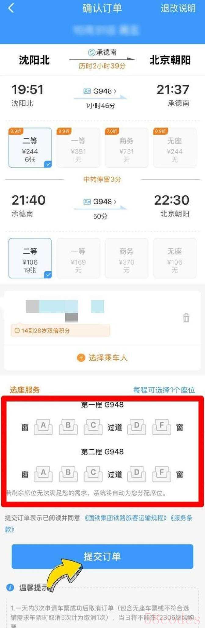 接下来是正常的购票步骤:添加乘车人信息并选座。注意每一段都会有具体座位号,尤其第二段的座位一定要记住或截图。选好了就提交订单。下单页面会把两段的车次、出发到达站、换乘站和座位号都展示出来,务必仔细核对一遍。确认无误后支付,系统出票后相关信息会保存在订单里。