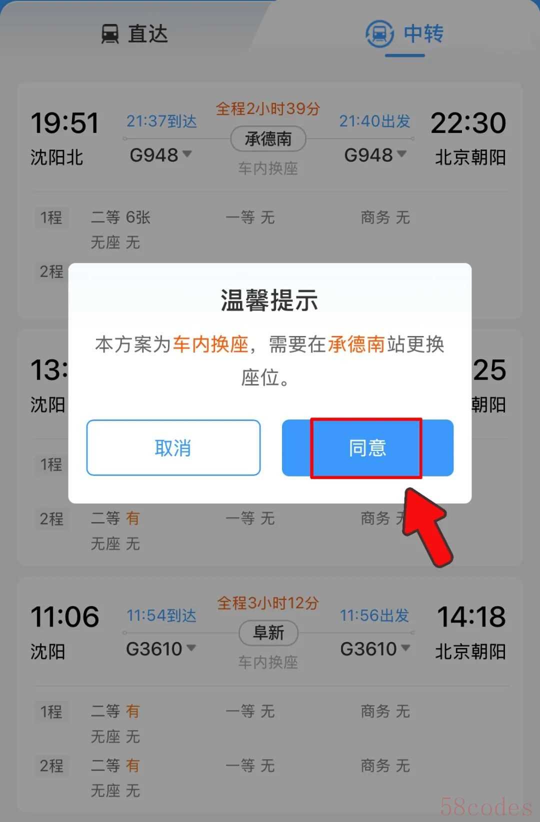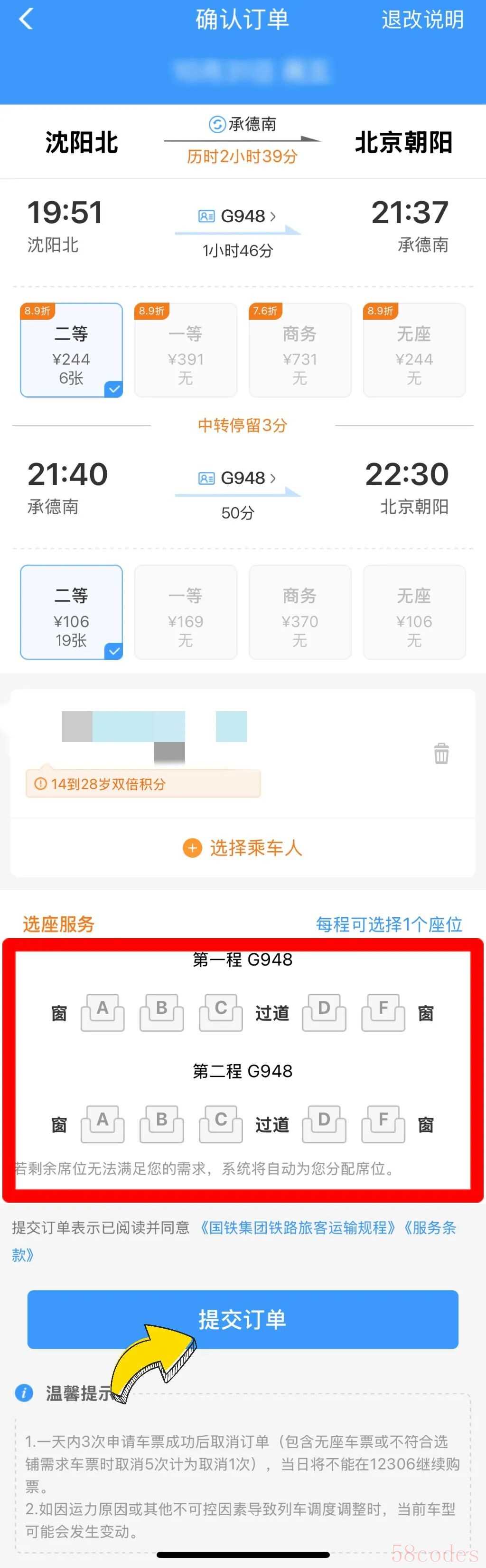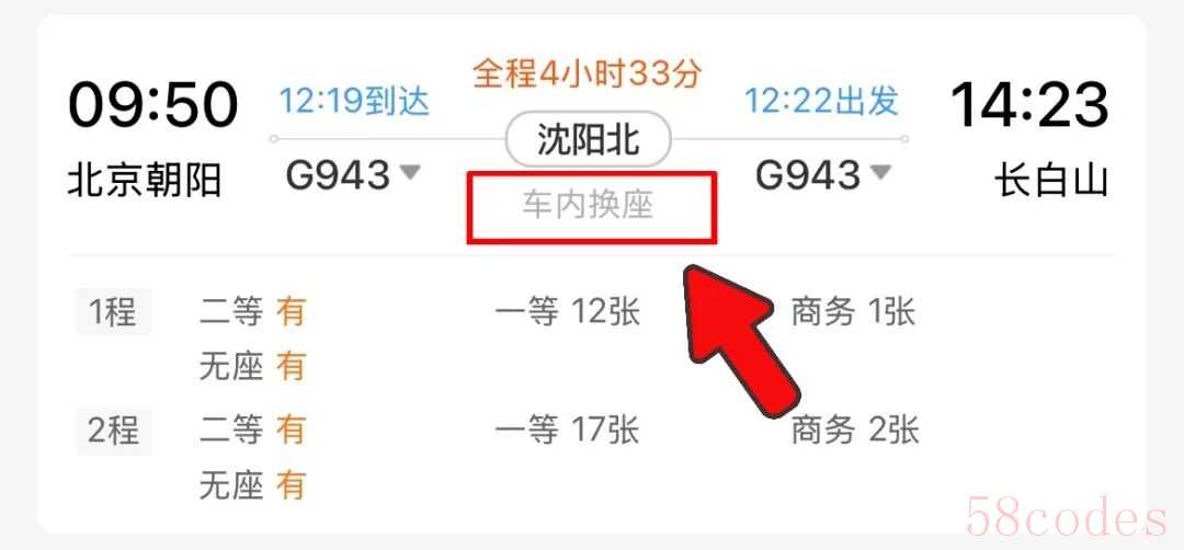 车内换座在提交购票信息时系统也会提示,旅客只需根据第2程信息,找到对应席位即可。
