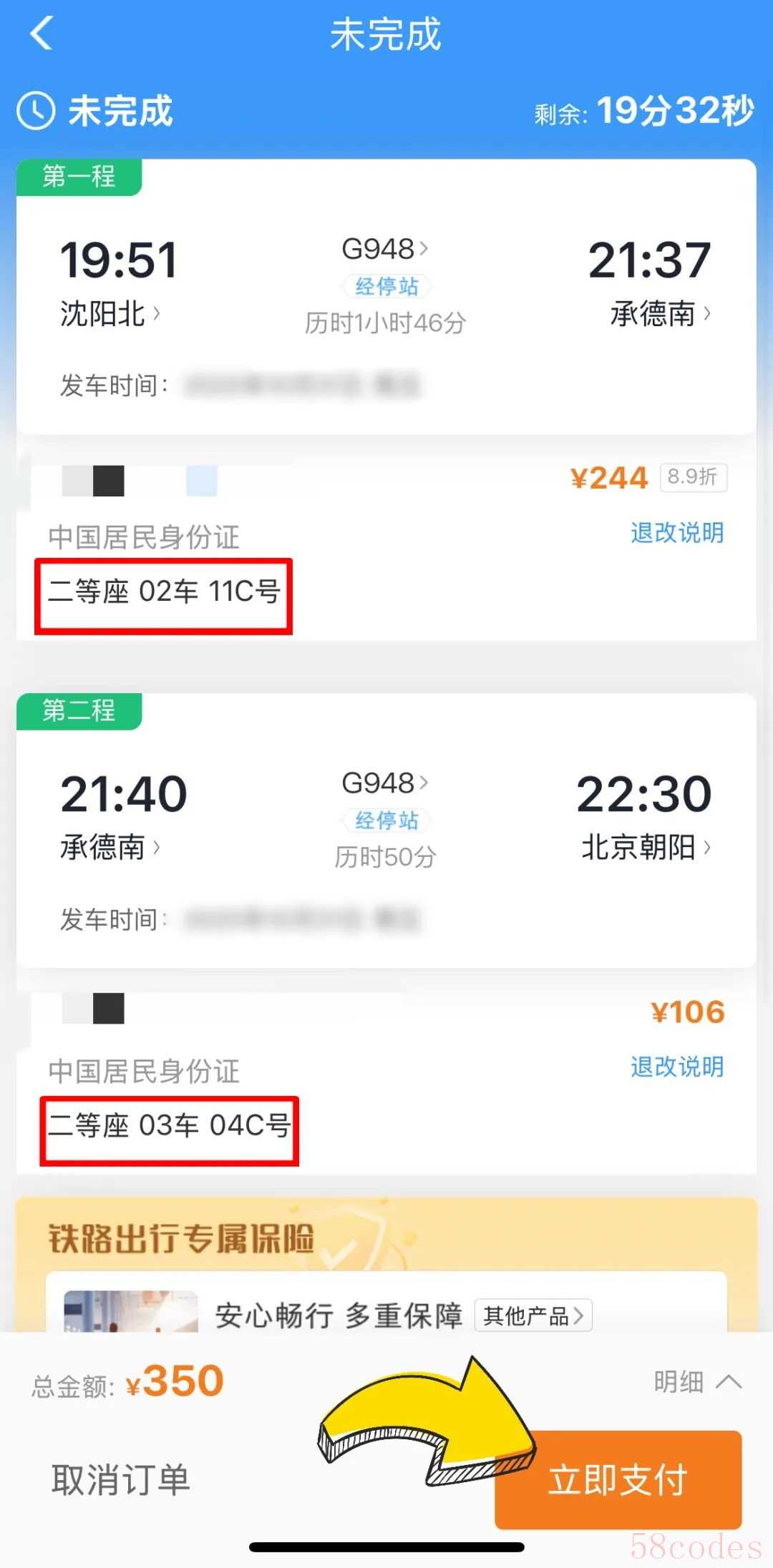 查看两段车程的座位号
