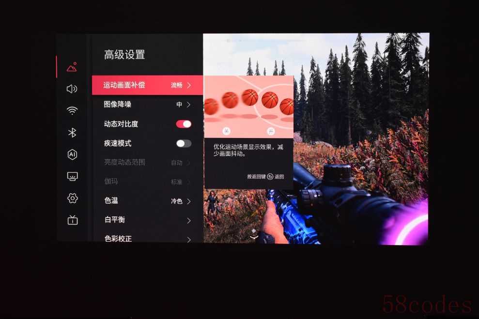 对于使用Vidda C1来打游戏的娱乐场景,有码君并没有太多意见,大屏打游戏确实很爽。不过在打游戏的时候,我们只需要知道此时遥控器可以在不中断游戏的同时,进行各种画面的调节,包括运动补偿、对比度,以及C1提供的一系列自定模式,我们根据自己的喜好选择就可以了。