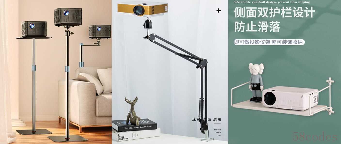 结合有码君自己选购投影仪支架的经历路程,先与大家聊聊如何选择支架这个问题。常见的投影仪支架安装有便携移动、打孔壁挂、桌面夹三种主流,以及这三种的多样变种,如下图: