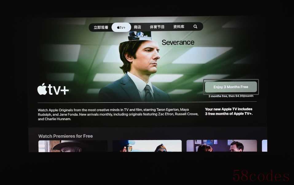 在自家所处的最普通的网络环境可以看TV+中的任何内容,新Apple TV用户可以领取3个月的免费试用,TV+中有不少自制剧可以观看。