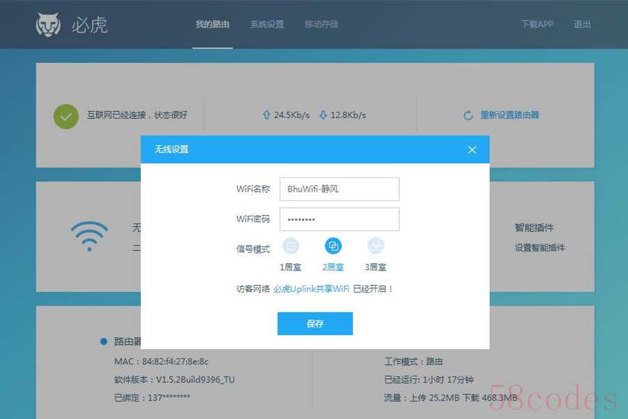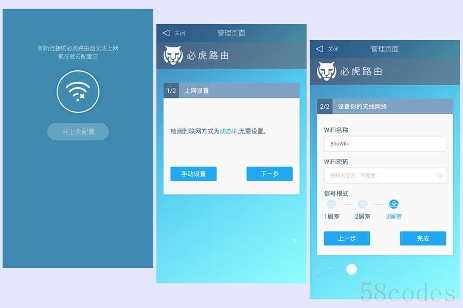 若想正常上网,我们需要对其进行配置,必虎会自动检测联网方式,笔者的是动态IP,所以直接跳到设置WiFi名称及密码界面,且还可以根据实际情况选择信号模式,与前文介绍的PC端一致。其实,必虎有一个很人性化的贴心功能就是密码搬家,换路由不用愁。