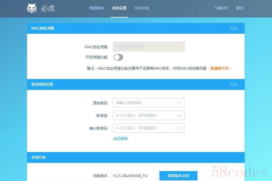 “系统设置”界面,可以对MAC地址进行克隆,但会提示谨慎开启,没特殊应用最好别去滑动那个开关。还有‘登录密码设置’和‘本地升级’的相关选项,根据需要操作即可。